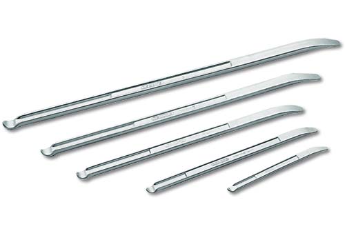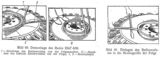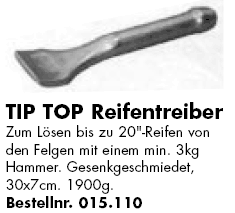 | Wenn Ihr mal richtig Lust auf Dummheiten habt, wechselt mal einen 14.00/20 er Reifen von Hand. Ist ein interessantes Erlebnis, ich habe mir gleich zweimal mit einem Montagehebel die Fresse poliert. Wie soll man es machen? Zuerst natürlich den Wagen aufbocken, und den Reifen abnehmen. Soweit klar, aber wie kriegt man den Pneu dann runter? Zuerst mal mit dem richtigen Werkzeug. Unbedingt haben muss man zwei richtige Montagehebel aus Werkzeugstahl, zum Beispiel die Hebel Gedore 38 und Gedore 39. Die grösste und schwerste Version ist nie ein Fehler. Ebenfalls sehr zu empfehlen ist ein Reifentreiber. Sobald das Rad runter ist, sollte man die Luft ablassen. Danach kommt der schwierige Teil. Man muss jetzt nämlich die Reifenschulter (sprich die Seite des Reifens) nach innen in die Felge drücken. Dort ist der Umfang der Felge geringer, so kommt der Reifen lose. Wenn man sich vor Augen führt, daß die Auflage des Reifens auf der Felge ca 4 Zentimeter breit ist, wird klar daß diese dementsprechend schwer nach innen zu kriegen ist. Es hilft, wenn man den Reifen flach hinlegt und mit Seifenwasser übergiesst, damit beim Hebeln schon mal Wasser in den Zwischenraum zwischen Felge und Reifen eindringen kann. Auch ein Tipp aus der Praxis ist, mit dem Wagen auf die Reifenflanke zu fahren. Man sollte nur vorsichtig sein, daß die Felge nicht so am Reifenfestsitzt, daß sie dessen Wulst in Fetzen reisst. Bringt auch das nichts, kann man den Reifen auch unter das Fahrzeug legen und mit dem Wagenheber ganz gezielt Druck ausüben. Hat man den Reifen rundum ein Stück nach innen gedrückt, kann man den Sprengring entfernen. Dabei auf keinen Fall mit dem Hebel Kraft nach oben ausüben, man glaubt gar nicht wie leicht der zu verbiegen ist. So einen Ring ohne Schweissbrenner zu richten ist so gut wie unmöglich. Der Sprengring darf auf einer Länge von 5 cm maximal 1,5 mm Abstand zur Felge haben, sonst springt er nachher beim Aufpumpen wieder raus. Ist der Sprengring runter, kann man auch die Felgenschulter entfernen. Nun lässt sich der Reifen umdrehen und über die Vorderseite abdrücken. Hier erstmal die Bilder, sieht alles ganz einfach aus..